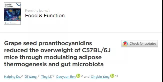 結果表明GSPE可改善高脂飲食誘導的小鼠胰島素抵抗和肥胖,這種作用可能是由于GSPE對腸道菌群和短鏈脂肪酸的調節作用進而影響棕色脂肪組織(BAT)產熱和白色脂肪組織(WAT)褐變有關。