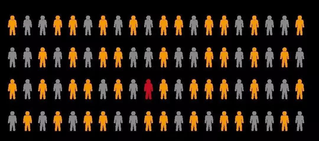 100個老人里,得類風濕的比例(紅色)和得骨關節炎的比例(橙色)