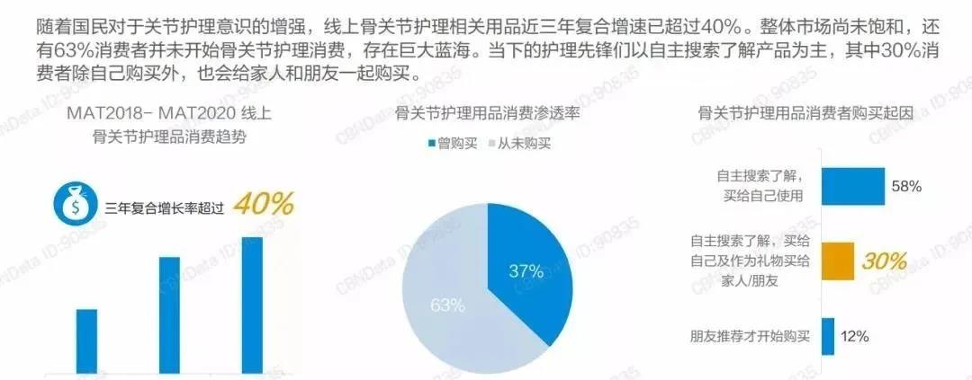 CBNData發布的2020《骨關節健康白皮書》顯示,骨關節已成為消費者重視的前十大健康問題之一,約76%的受訪者存在骨關節不適癥狀或已確診存在骨關節不適問題,且涵蓋了各個年齡段,如中老年人、白領上班族、運動愛好者、超重人士等。消費者的骨關節健康意識也有所增強,近三年骨關節護理相關用品的線上增速超過了40%。
