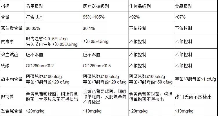 透明質(zhì)酸鈉各級(jí)別劃分及其對(duì)應(yīng)指標(biāo)