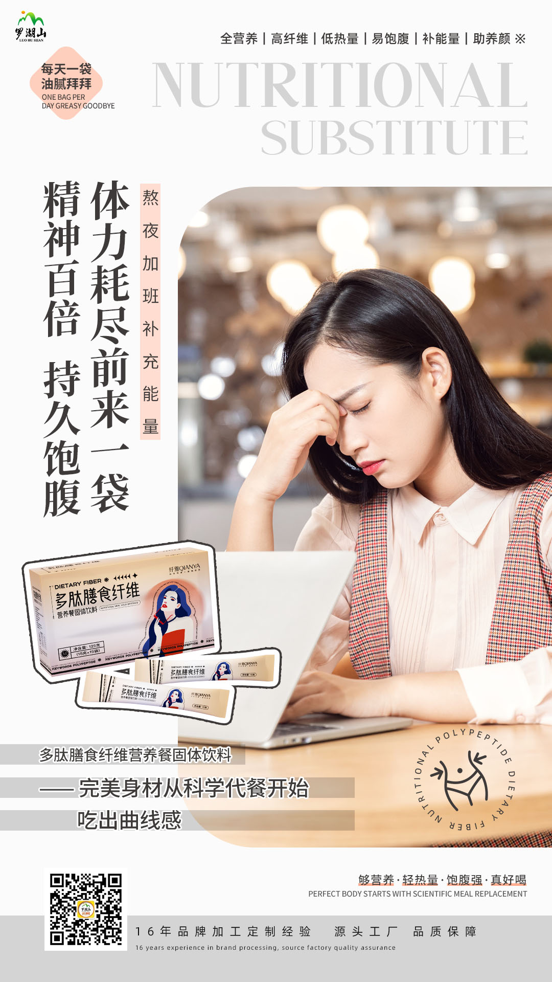 廣州羅湖山生物醫藥科技有限公司特推出多肽膳食纖維營養餐,富含膳食纖維,添加多種小分子肽,高營養,低熱量,強飽腹。